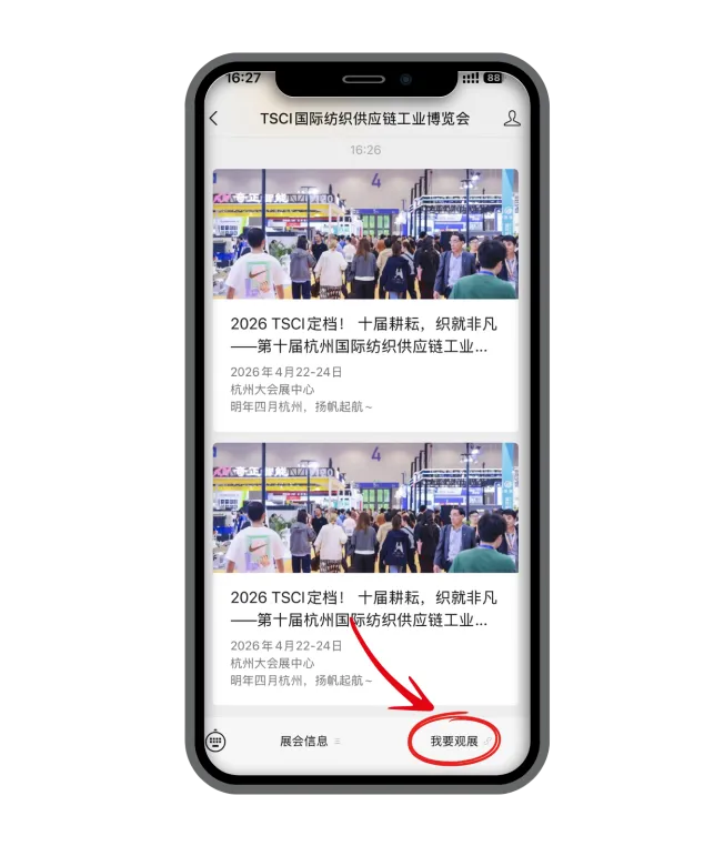 第一步 搜索并官方:TSCI國際紡織供應鏈工業博覽會”或者“國際紡織供應鏈工業博覽會”。第二步 打開對話欄。第三步 點擊“我要觀展”。
